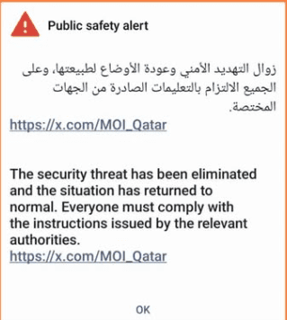 கத்தார் தலைநகர் தோஹா (Doha) பகுதியில் பலத்த வெடிப்பு (explosion) போன்ற சத்தங்கள் கேட்கப்பட்டதாக தகவல்கள் வெளியாகியுள்ள நிலையில், பாதுகாப்பு அச்சுறுத்தல் (security threat) தற்போது நீக்கப்பட்டுள்ளதாக கத்தார் உள்துறை அமைச்சகம் (Qatar Ministry of Interior) தெரிவித்துள்ளது.