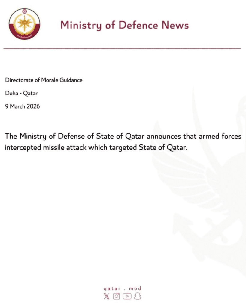 இதற்கிடையில், கத்தார் பாதுகாப்பு அமைச்சகம் (Qatar Ministry of Defence) வெளியிட்ட சுருக்கமான அறிக்கையில், “கத்தார் நாட்டை (State of Qatar) இலக்காகக் கொண்டு நடத்தப்பட்ட ஏவுகணை (missile) தாக்குதலை ஆயுதப்படைகள் (armed forces) தடுத்து நிறுத்தியுள்ளன” என அறிவிக்கப்பட்டுள்ளது.