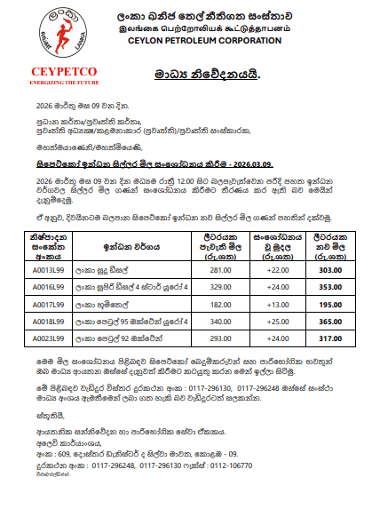 இந்த விலை மாற்றம் நள்ளிரவுடன் நடைமுறையாகும் என இலங்கை பெற்றோலியக் கூட்டுத்தாபனம் அதிகாரபபூர்வ அறிவிப்பு வெளியிடப்பட்டுள்ளது.