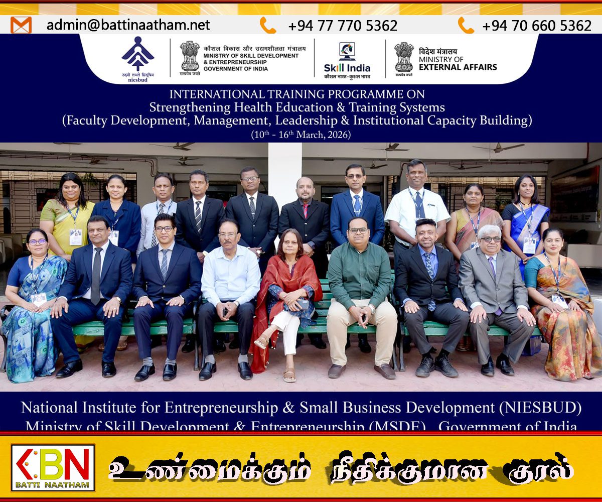 இலங்கை அரசாங்கத்தின் வேண்டுகோளின் பேரில், 16 இலங்கை சுகாதார வல்லுநர்களுக்கான திறன் மேம்பாட்டுத் திட்ட பயிற்சிக்காக இந்தியா நொய்டாவில் உள்ள தேசிய தொழில் முனைவோர் மற்றும் சிறு வணிக மேம்பாட்டு நிறுவனத்தால் (NIESBUD) முன்னெடுக்கப்பட்ட ஒருவார பயிற்சியில் பங்கேற்றனர் என இந்திய உயர்தானியர் காரியாலம் அறிவித்துள்ளது.